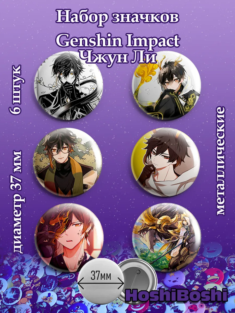 Набор из 6 металлических значков с изображениями из игры Геншин Импакт ( Genshin Impact ).