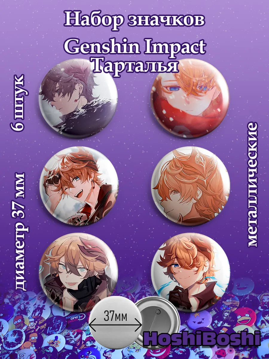 Набор из 6 металлических значков с изображениями из игры Геншин Импакт ( Genshin Impact ).