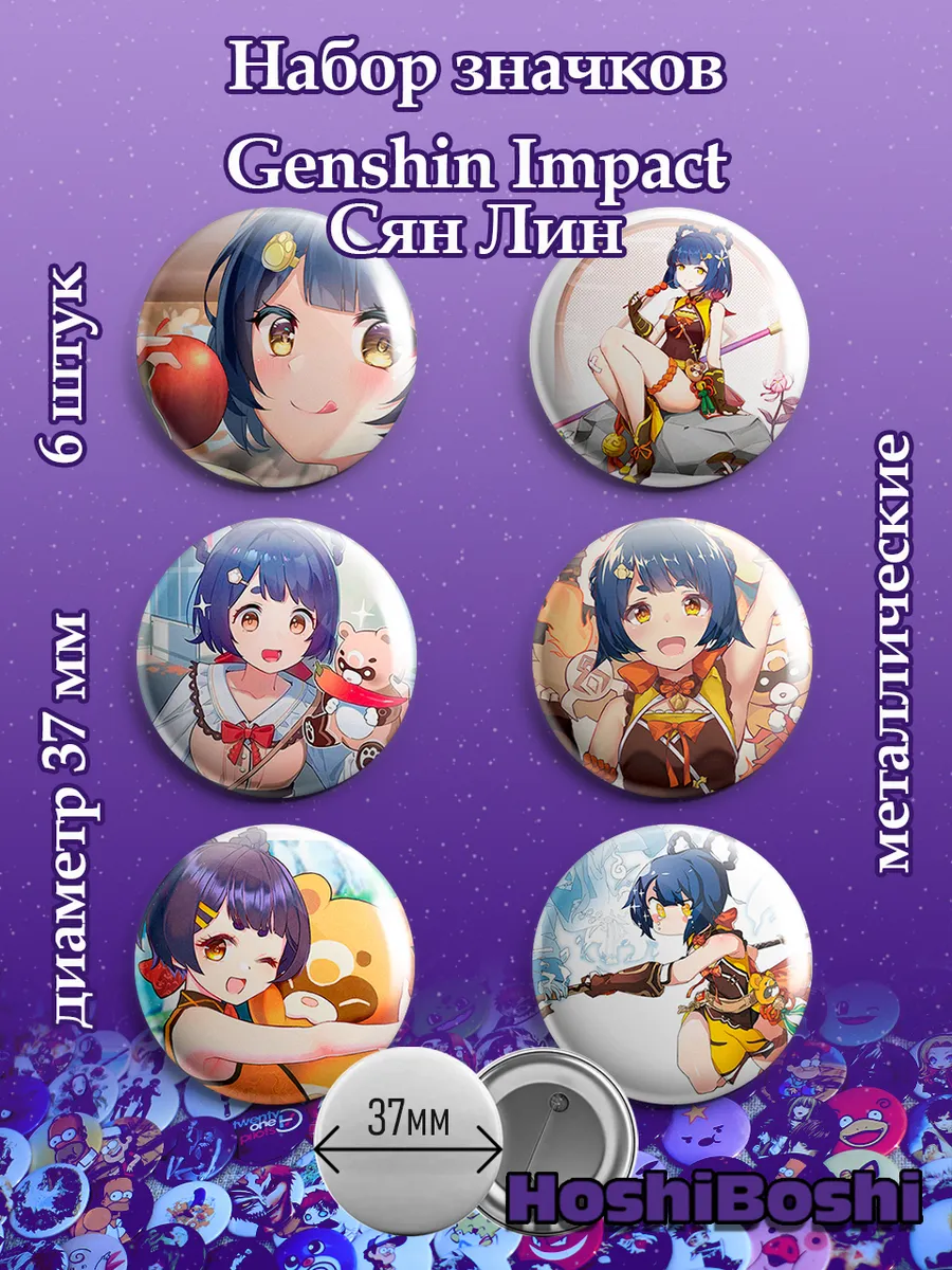 Набор из 6 металлических значков с изображениями из игры Геншин Импакт ( Genshin Impact ).