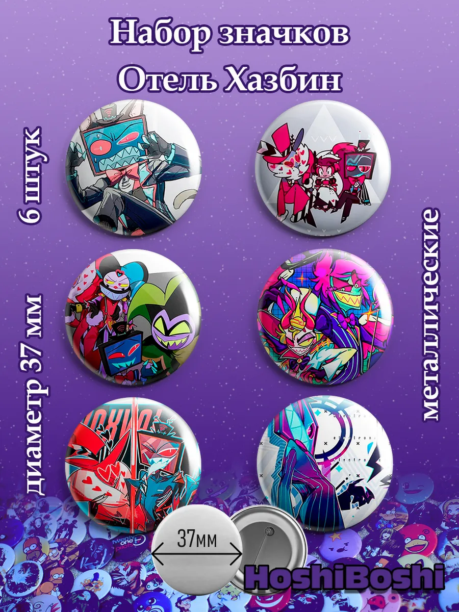 Набор из 6 металлических значков с изображениями из мультсериала Отель Хазбин ( Hazbin Hotel ).