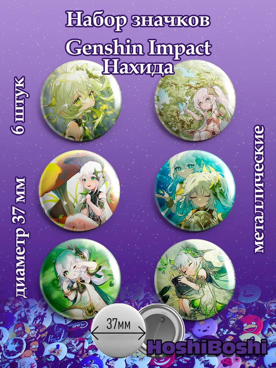 Набор из 6 металлических значков с изображениями из игры Геншин Импакт ( Genshin Impact ).