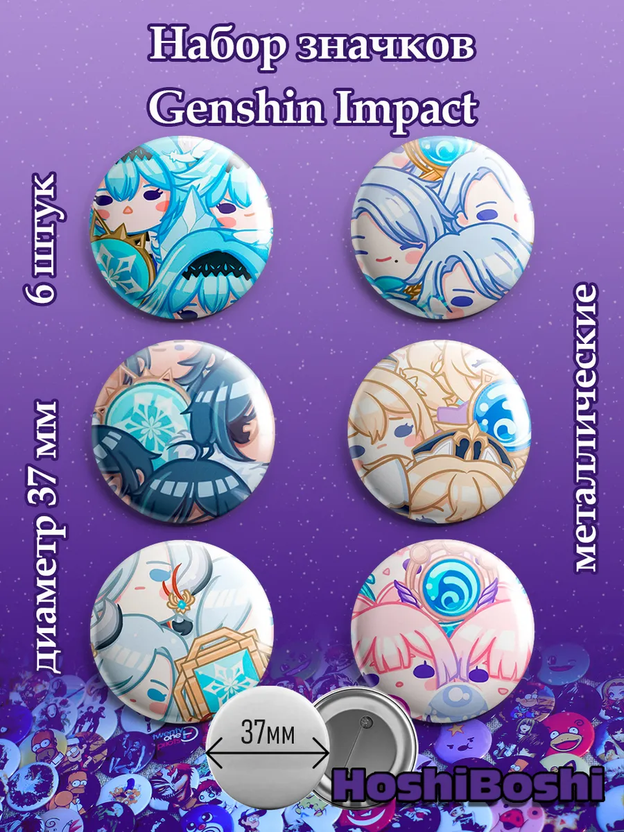 Набор из 6 металлических значков с изображениями из игры Геншин Импакт ( Genshin Impact ).