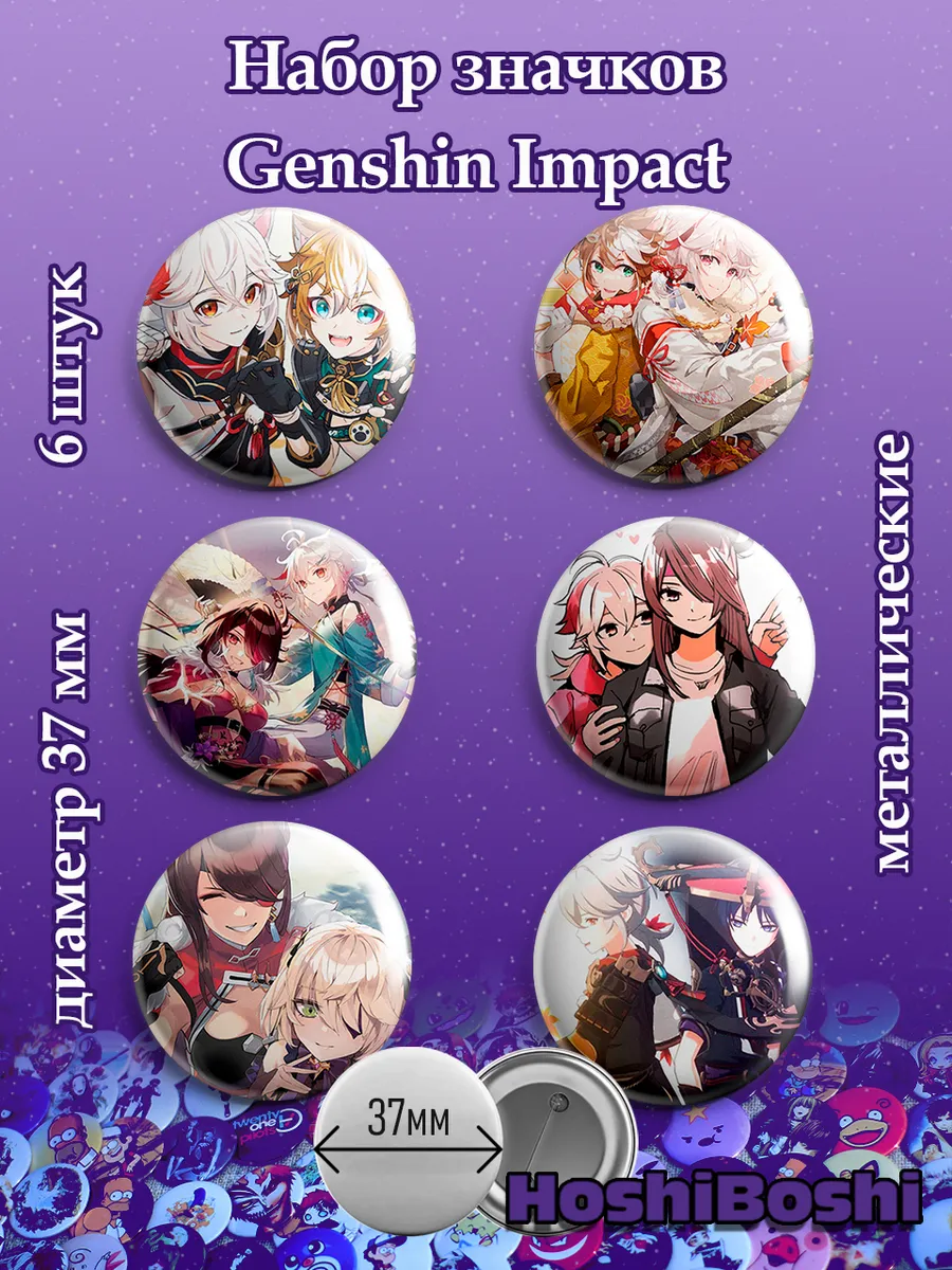 Набор из 6 металлических значков с изображениями из игры Геншин Импакт ( Genshin Impact ).