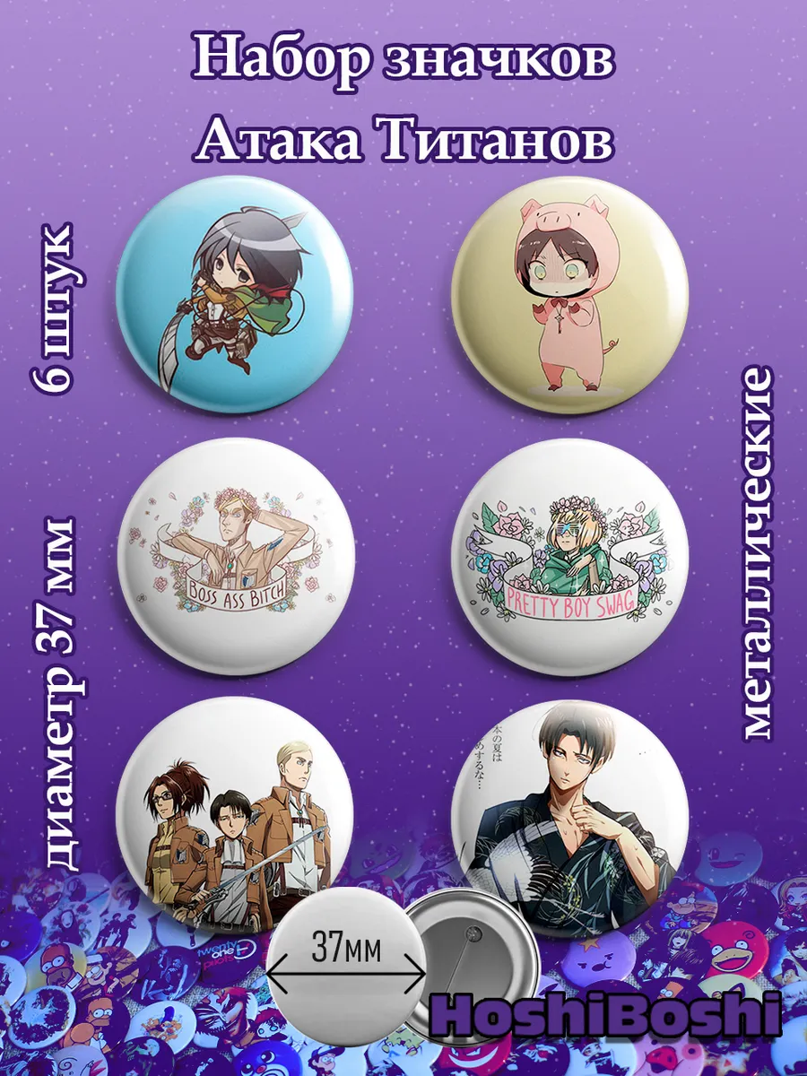 Набор из 6 металлических значков с изображениями из аниме Атака Титанов ( Shingeki no Kyojin Attack on Titan ).