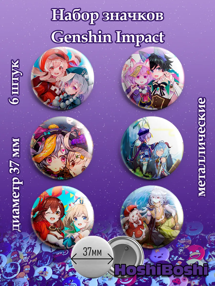 Набор из 6 металлических значков с изображениями из игры Геншин Импакт ( Genshin Impact ).