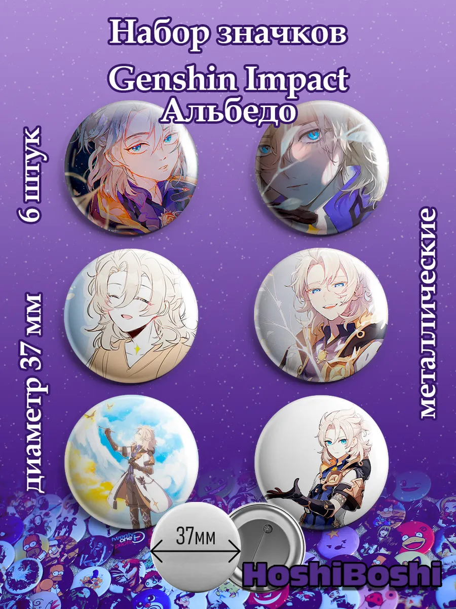 Набор из 6 металлических значков с изображениями из игры Геншин Импакт ( Genshin Impact ).