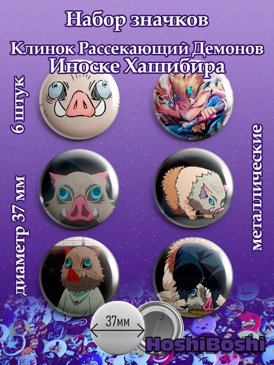 Набор из 6 металлических значков с изображениями из аниме Клинок Рассекающий Демонов ( Demon Slayer: Kimetsu no Yaiba ).