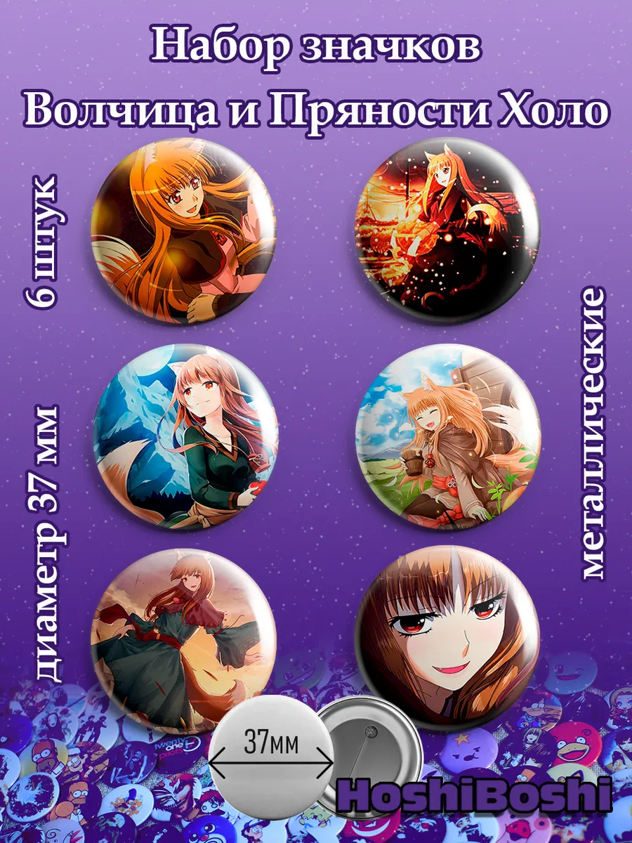 Набор из 6 металлических значков с изображениями из аниме Волчица и пряности ( Spice and Wolf Ookami to Koushinryou ).