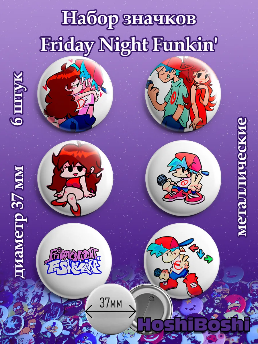 Набор из 6 металлических значков с изображениями из игры Фридэй Найт Фанки ( Friday Night Funkin ).