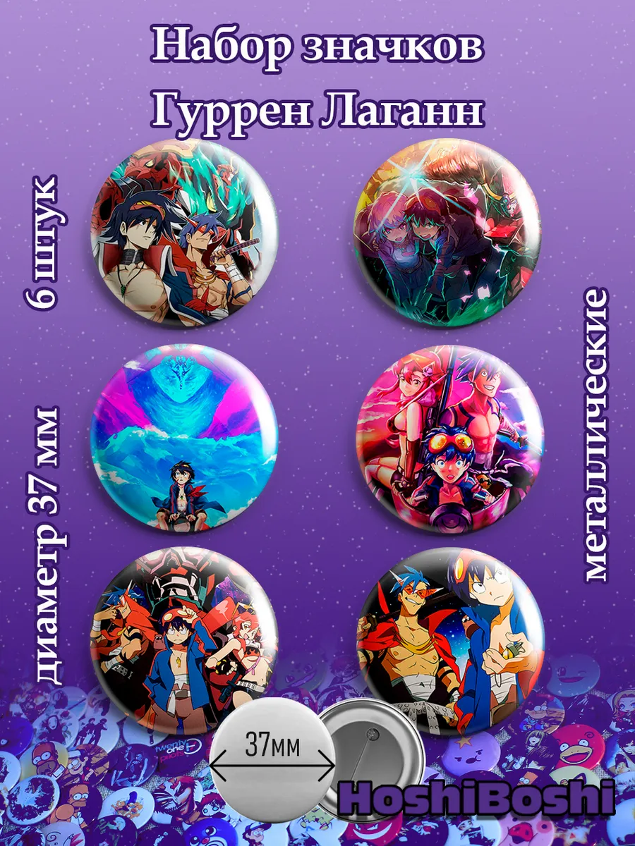 Набор из 6 металлических значков с изображениями из аниме Гуррен Лаганн ( Tengen Toppa Gurren Lagann ).
