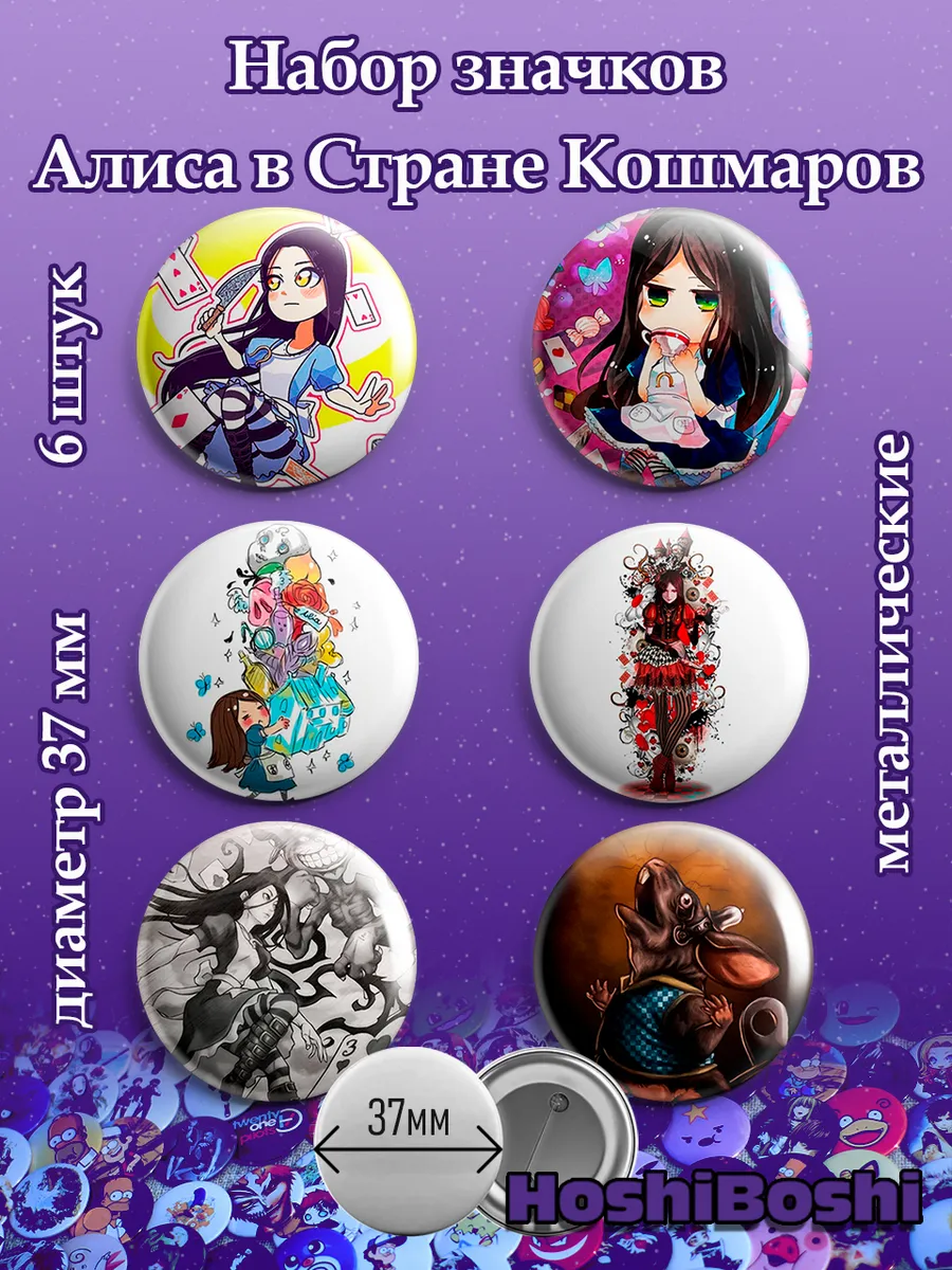 Набор из 6 металлических значков с изображениями из игры Алиса в Стране Кошмаров ( Alice: Madness Returns ).