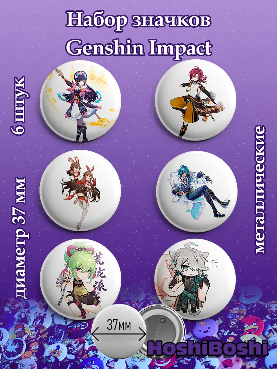 Набор из 6 металлических значков с изображениями из игры Геншин Импакт ( Genshin Impact ).