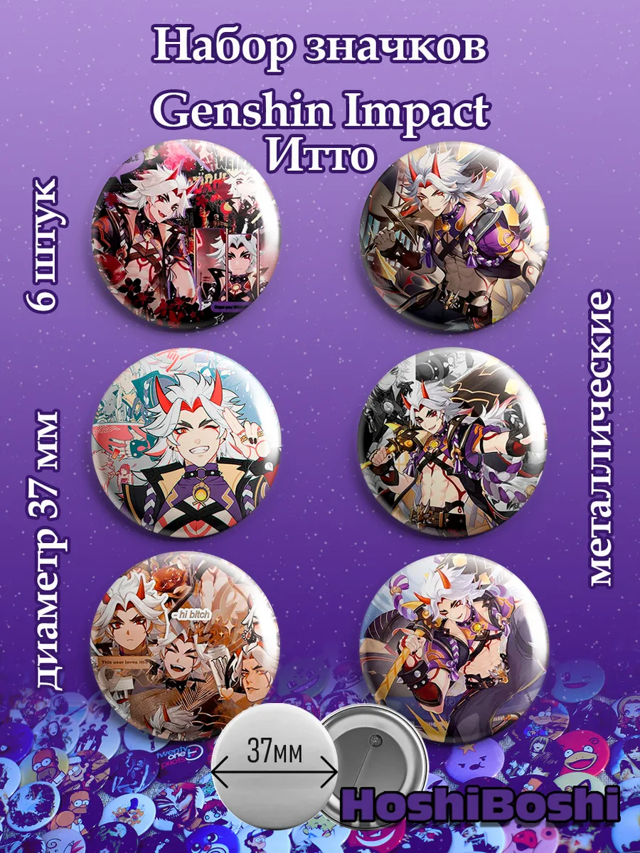 Набор из 6 металлических значков с изображениями из игры Геншин Импакт ( Genshin Impact ).