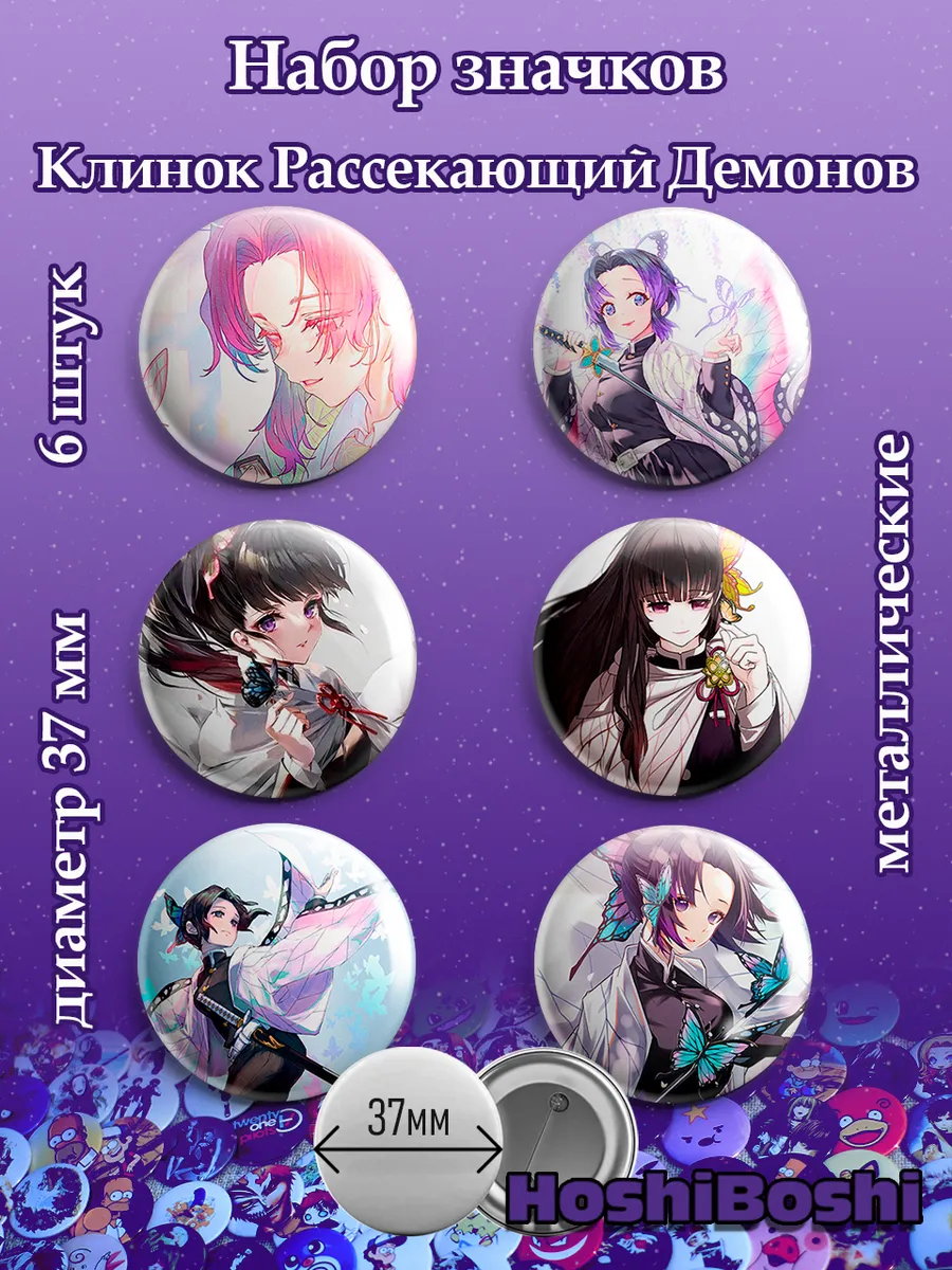 Набор из 6 металлических значков с изображениями из аниме Клинок Рассекающий Демонов ( Demon Slayer: Kimetsu no Yaiba ).