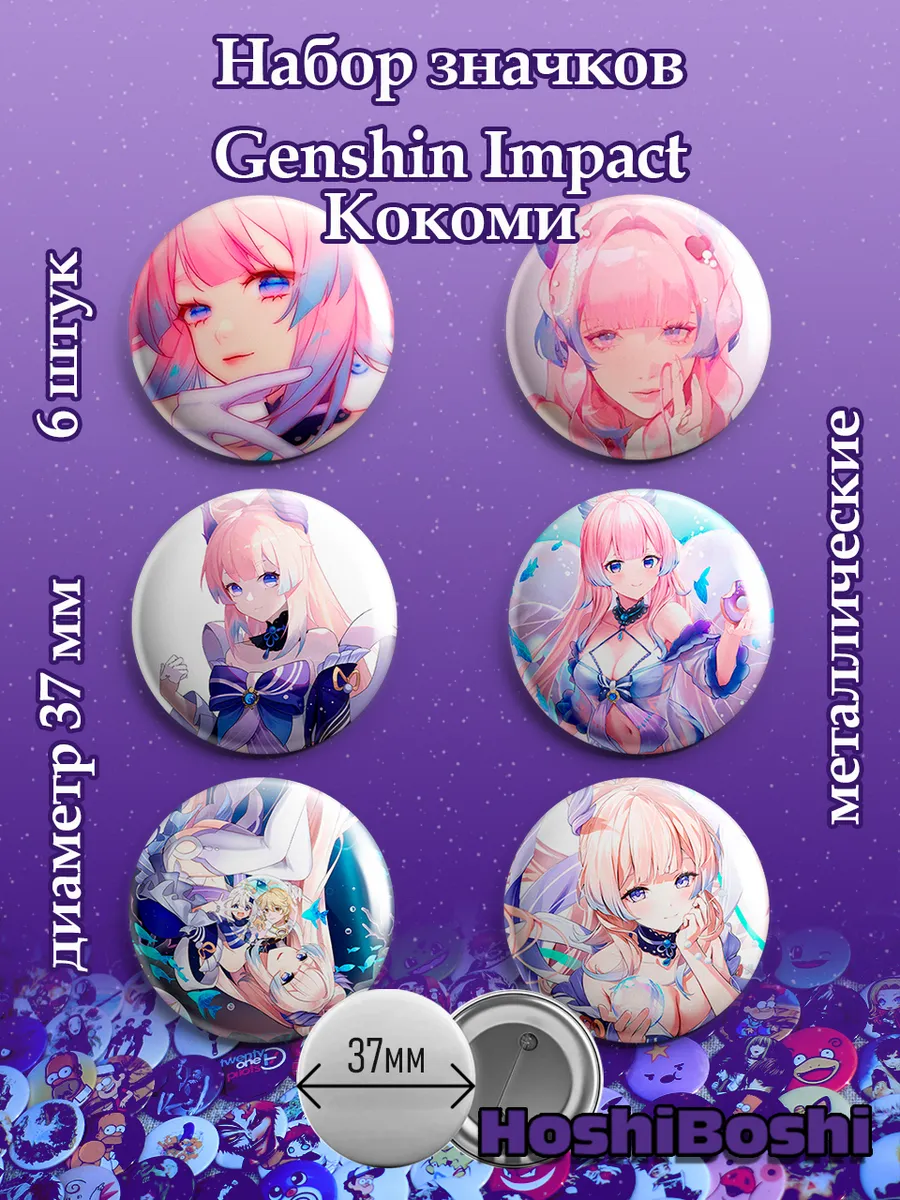 Набор из 6 металлических значков с изображениями из игры Геншин Импакт ( Genshin Impact ).