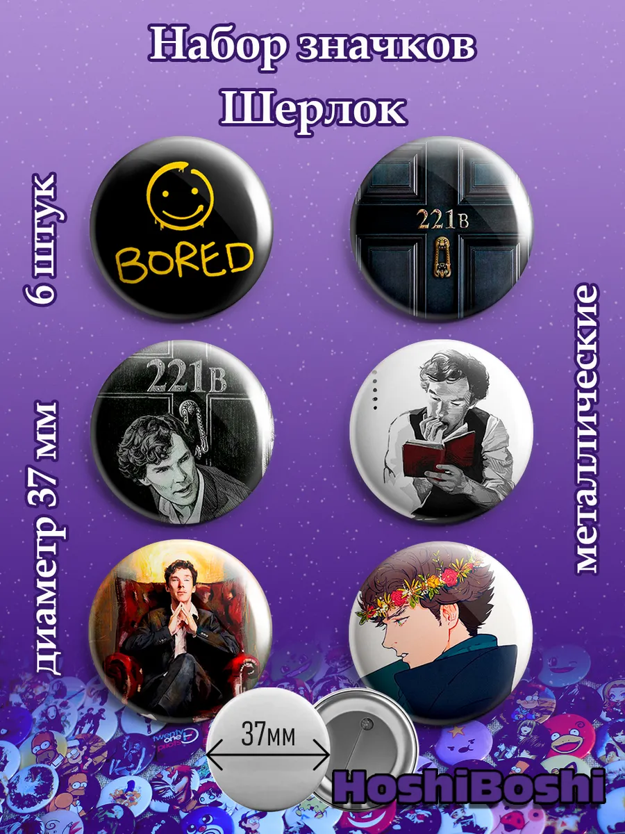 Набор из 6 металлических значков с изображениями из сериала Шерлок ( Sherlock ).